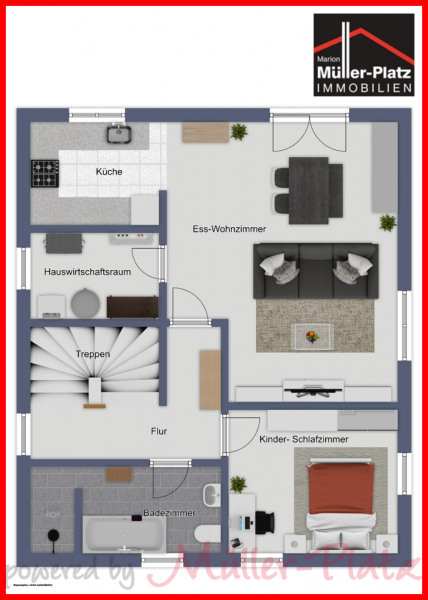 Die Wohnung erstreckt sich über zwei Etagen und verfügt über einen eigenen Hauseingang. Vom Eingangsbereich aus führt eine Treppe in den Flur des 1. Obergeschosses. Von hier aus gelangen Sie geradeaus in das Badezimmer und auf der linken Seite in das erste, lichtdurchflutete Schlafzimmer mit zwei Fenstern. Weiter entlang des Flurs öffnet sich das großzügige Wohn- und Esszimmer, das in die offene Wohnküche übergeht. Von hier aus gelangen Sie über eine Terrassentür auf den Balkon, der zusätzlichen Komfort im Freien bietet. Ein separater Raum neben der Küche beherbergt den Hausanschlussraum mit ausreichend Platz für Waschmaschine, Trockner sowie den Sicherungskasten und die kontrollierte Wohnraumlüftung.